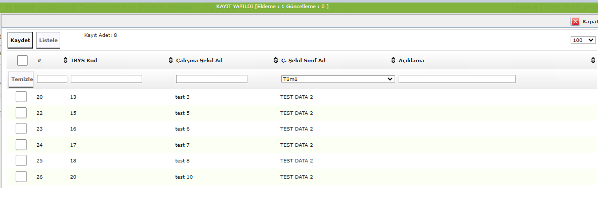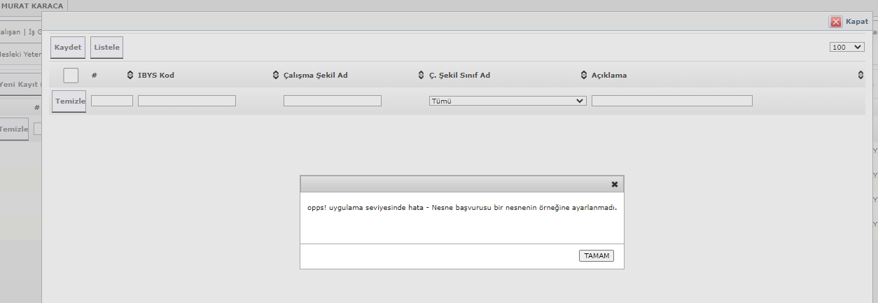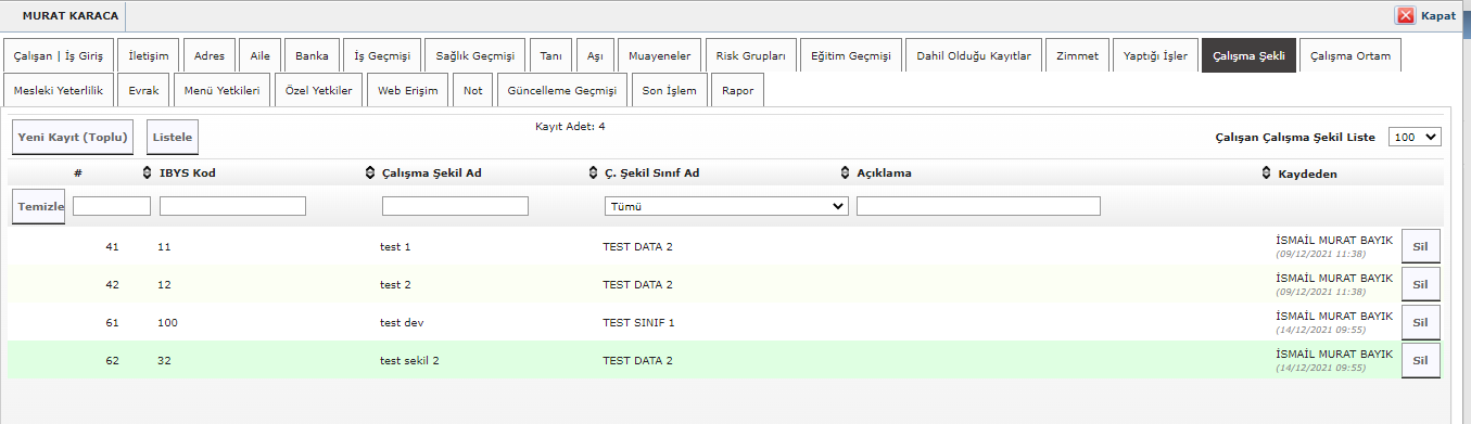 Açıklama | Personel kartı üzerindeki çalışma şekli sekmesinde revizyon "Ç.Şekil Sınıf Ad" ve "Açıklama" kolunu ekleyebilir miyiz? Suzan aklında olsun, bu gibi yerlerde sistem tarafından girdiğimiz ne kadar kolon ve bilgi var ise kullanıcı ekranlarına da onların hepsini mümkün olduğunca aynısını getiriyoruz. | ||||