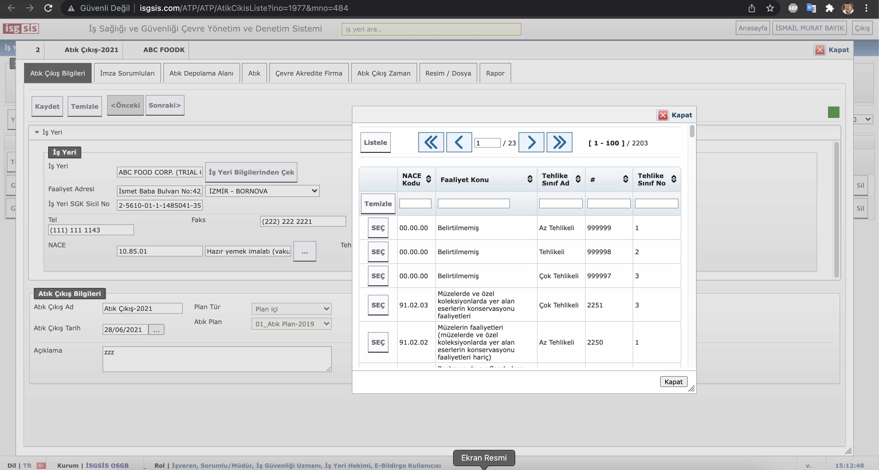 Atık çıkış ve atık plan kartı üzerinde iş yer bilgileri kısmındaki nace kodu penceresinin büyültülmesi