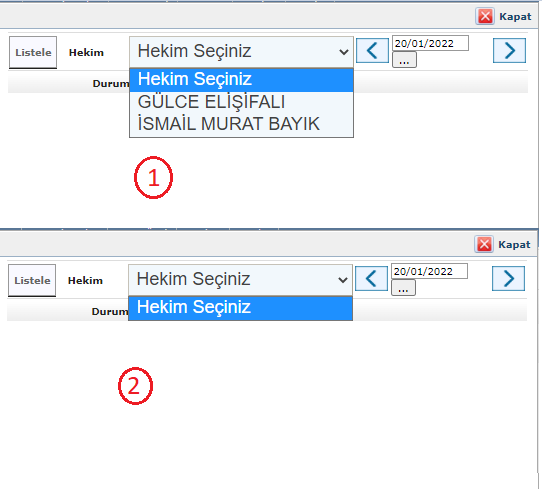 Önceden 2 numaralı durumda hekim olmadığında comboya hiç bir hekim-çalışan-no parametresi gelmediği için patlıyordu. |