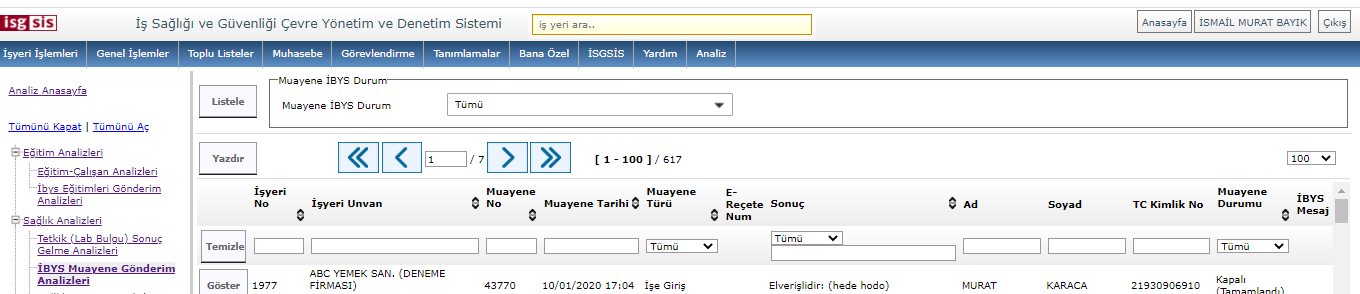 Açıklama | ANZ/ANZ/isyeriAnalizOzet. sayfasında İBYS Eğitim Gönderim Analizleri şeklinde bir bölüm var eğitim analizlerinin altında. Bunun tıpkısının aynısını sağlık analizleri başlığı altına yapabilir miyiz? "İBYS Muayene Gönderim Analizleri" şeklinde. bu listenin görünürlük şartları yine sağlık menüsündekiler ile aynı | ||||