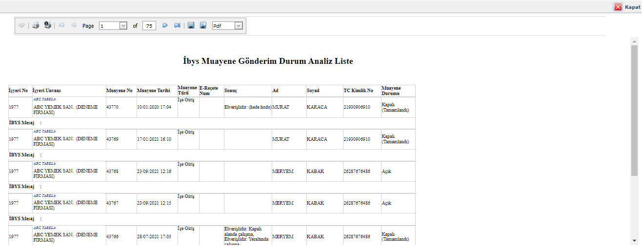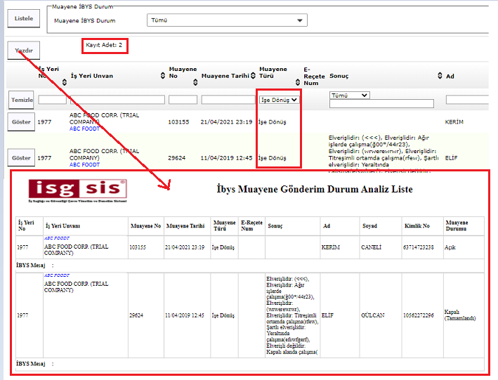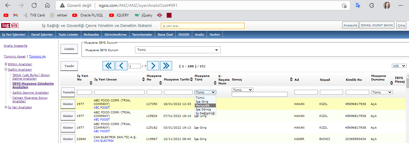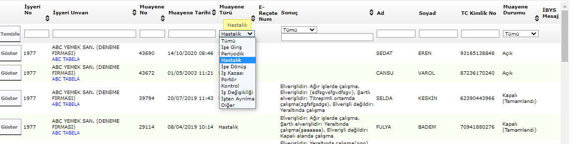 Muayene türü filtresinde tüm muayene türleri gözüküyor. Fakat biz ibys ye sadece 4 muayene türü gönderiyoruz; İşe Giriş Muayenesi Yukarıdaki muayene türleri dışında filtreden başka bir tür seçildiğinde listenin boş gelmesi gerekiyor. |
