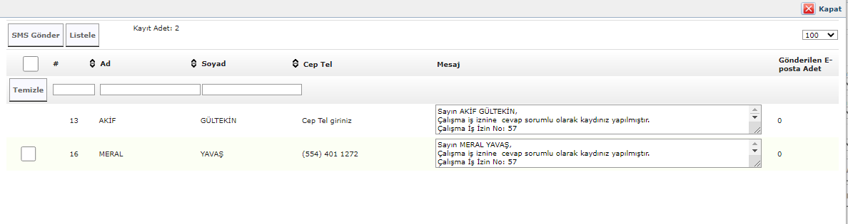 Sms alabilecek liste tamamlandı. sms gönder prosedürü yazılacak. |