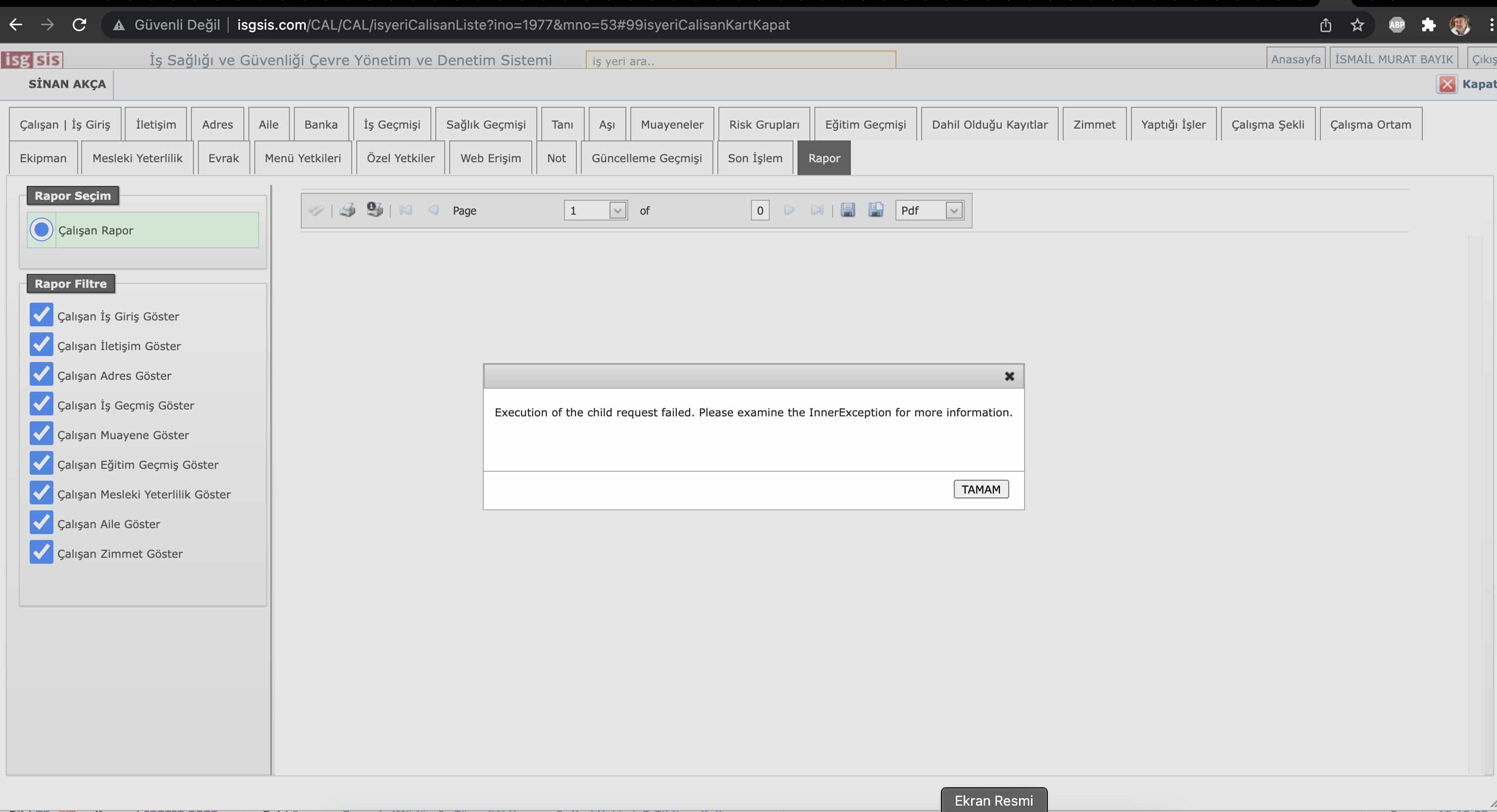 Açıklama | Personel kartı üzerinde rapor sekmesi hata veriyor düzeltebilir miyiz? | ||||
