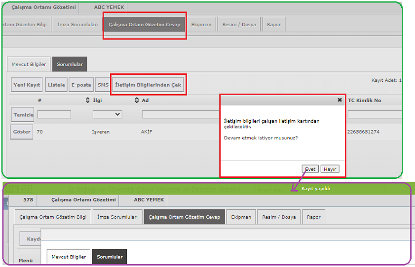 Benzer uygulamalar diğer aksiyonlardaki sorumlular sekmesi içinde var aynısını yapabiliriz.