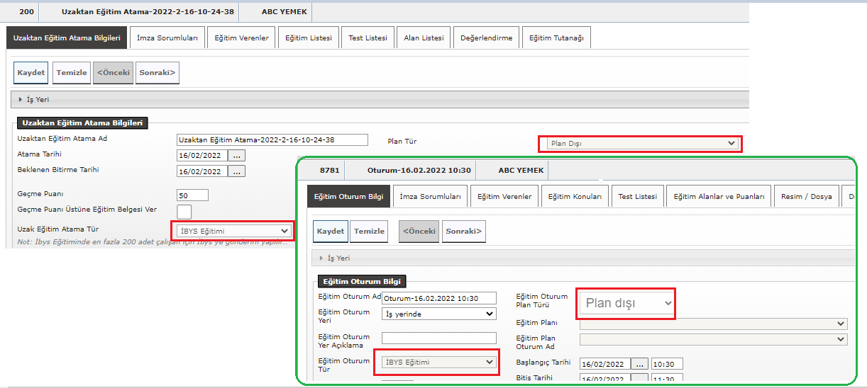 Açıklama | Örgün ve uzak eğitim kartlarında eğitim oturum tür ve uzak eğitim atama türünün değiştirilmesini engelleyelim tür seçildi ve kaydete basıldı geçmiş olsun bitti. artık tür bölümü disable olacak. Aynı eğitim plan içi plan dışın combosunda yaptığımız gibi. That's it... | ||||