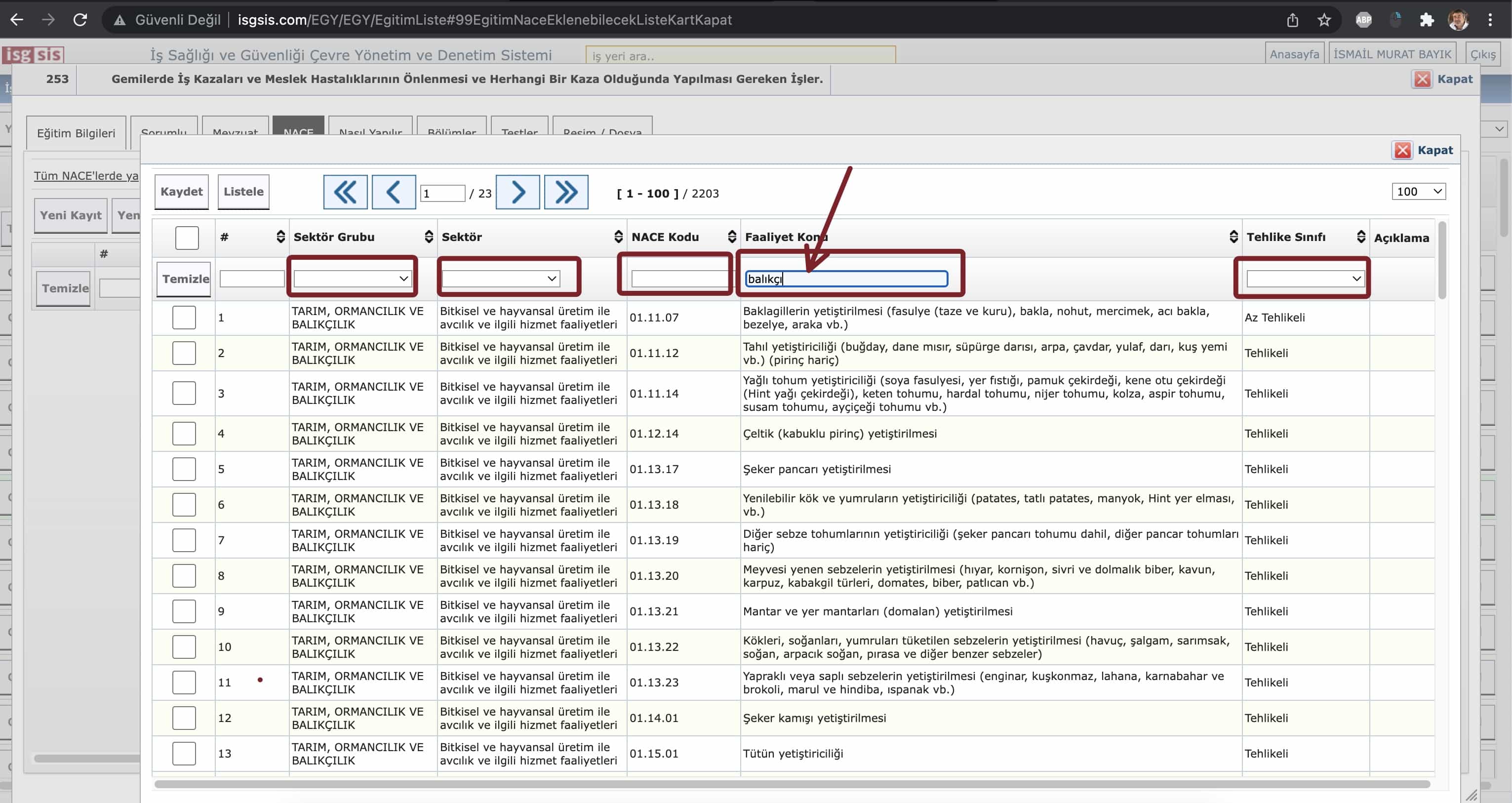 | Açıklama | Resimdeki belirttiğim yerdeki bugları giderebilir miyiz? 1- Boşluk olan dropboxların tümüne "Tümü" kelimesi koyalım (Sektör grubu/sektör/tehlike sınıfı) | ||||