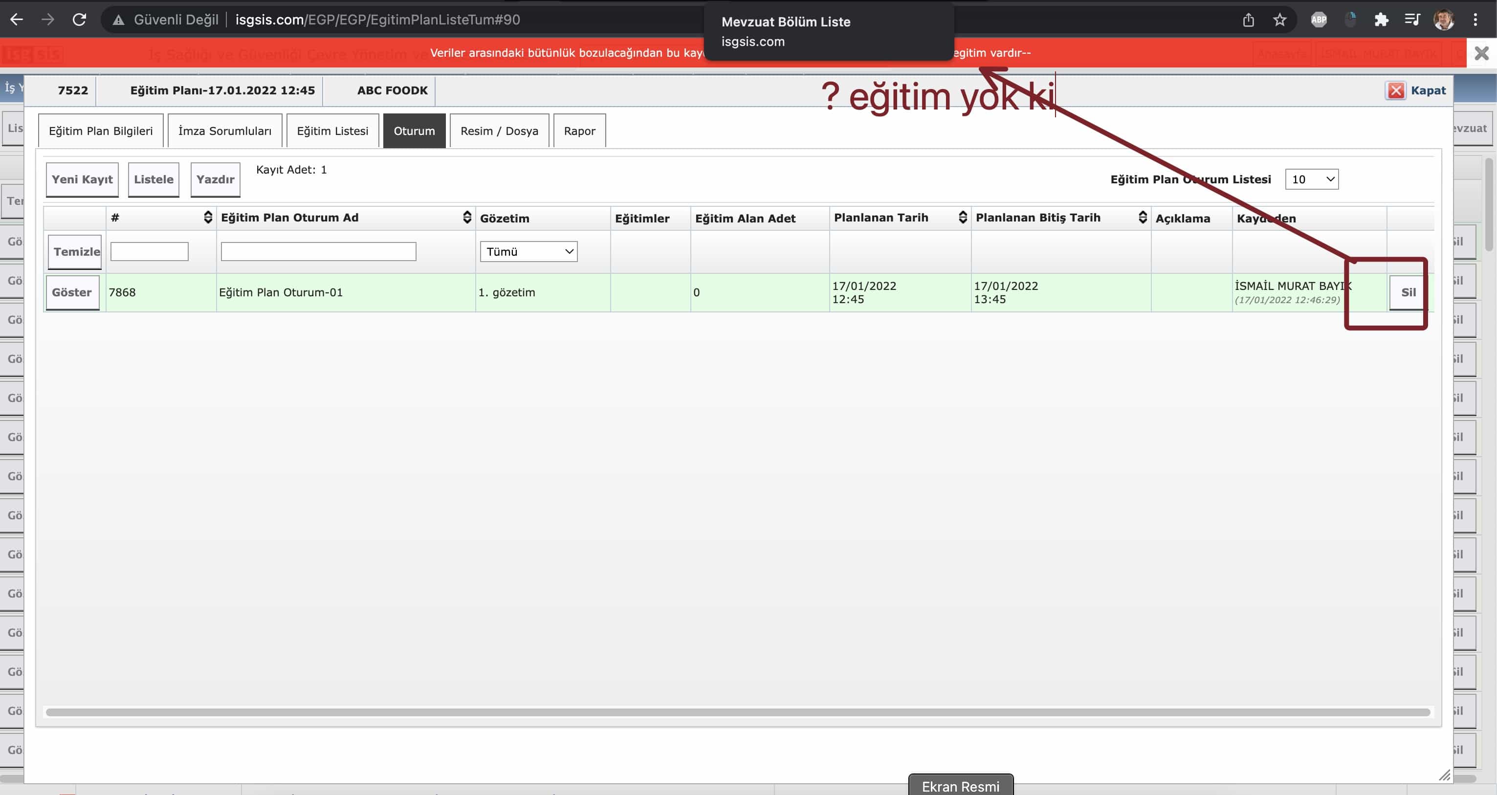 Özet0007011: resimdeki satırı silemiyorum eğitim var diyor eğitim sekmesinde eğitim yok halbuki silebilir miyiz bunu buradan