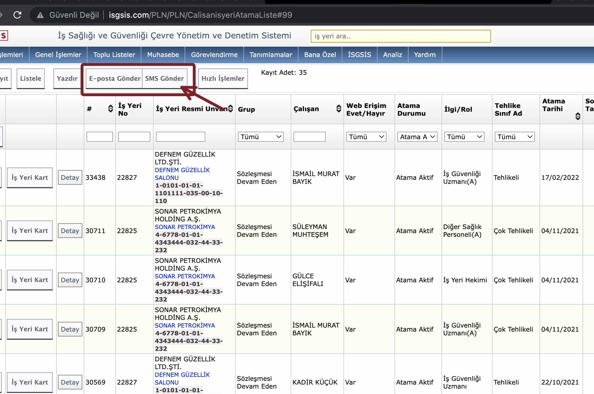 Görevlendirme sayfasında eposta ve sms butonu konusu