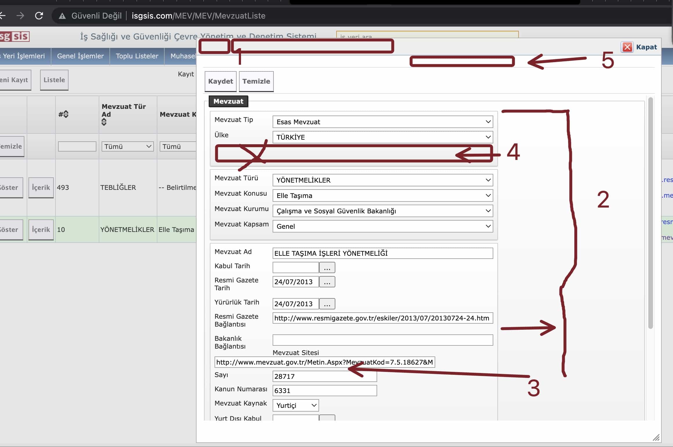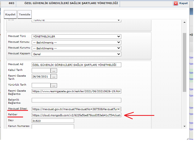 1- göster modda ID ve Mevzuat adını burada gösterelim 2- çerçevelerin sağ kısmını %30 kadar sağa doğru genişletelim Bu rehber metin kutusu sadece göster dediğimiz anda mı gözükecek? Yeni kayıt anında da kartın içinde olacaksa buraya girilen text arkada ki liste sayfasına düşecek mi? Ki göster anında olacaksa da yeni kayıt anında bu bilginin girilmesi lazım. Yeni mevzuat kaydının düştüğü tabloda Rehber başlığına karşılık gelen bir kolonumuz yok ise tabloya kolon eklemek gerekebilir. 4- işaret edilen yerdeki boşluğu kaldıralım 5- işaret edilen yerdeki boşluğu kaldıralım |
