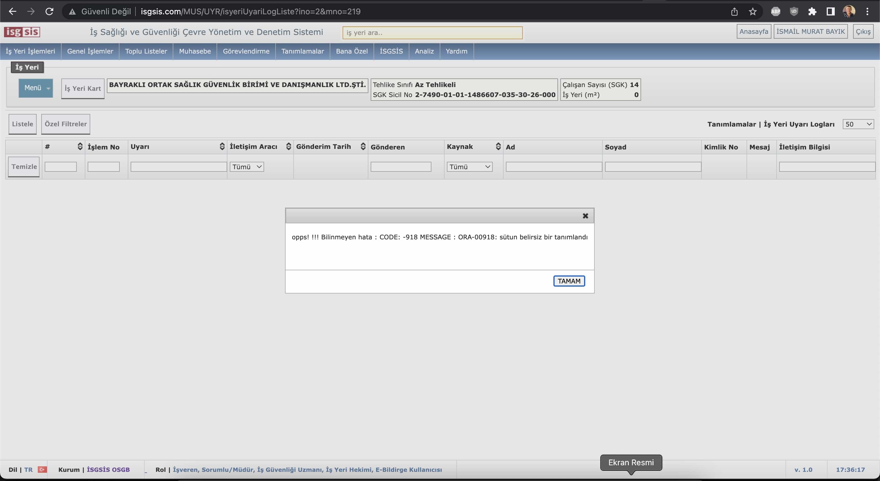 | Açıklama | uyarı bilgilendirme geçmiş sayfası ORA hatası veriyor düzeltebilir miyiz? | ||||