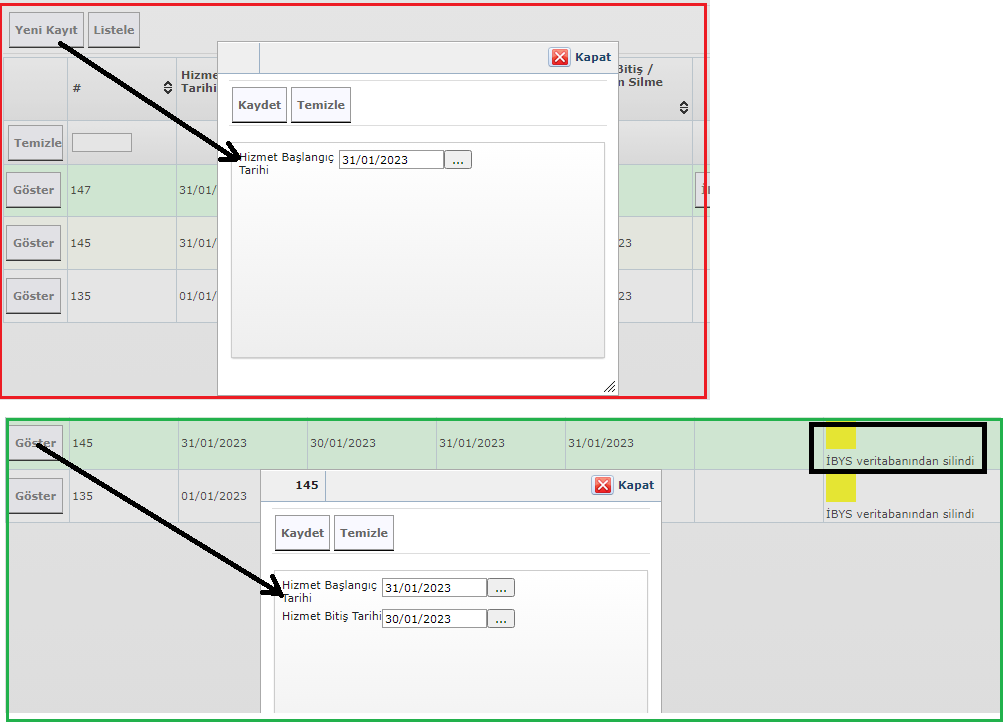 İBYS Durum eğer İBYS silindiden başka bir durumda ise Hizmet Bitiş Tarihi görünmeyecek.