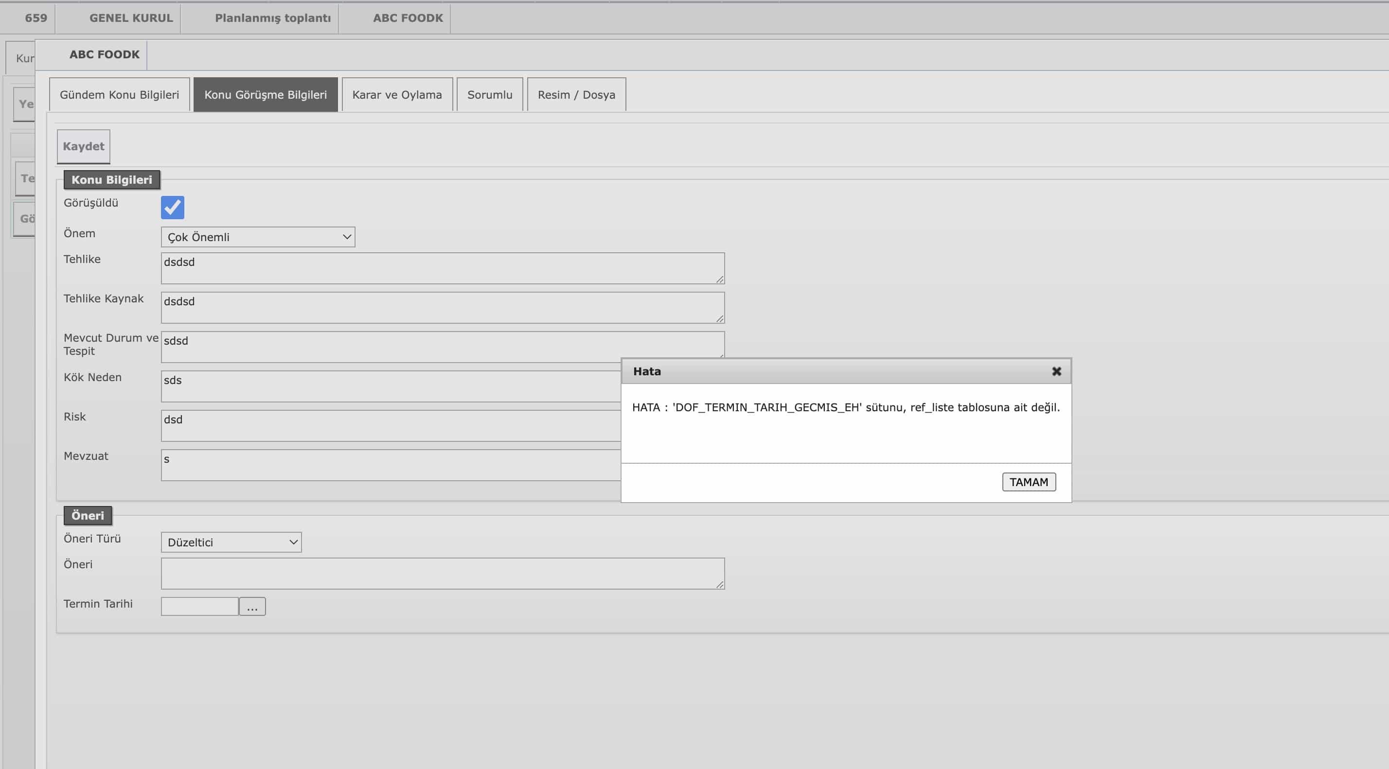 Açıklama | Kurul toplantı kartında gündem konusunda resimdeki yerde yazdıktan sonra kaydete basınca resimdeki hata çıkıyor düzeltebilir miyiz | ||||