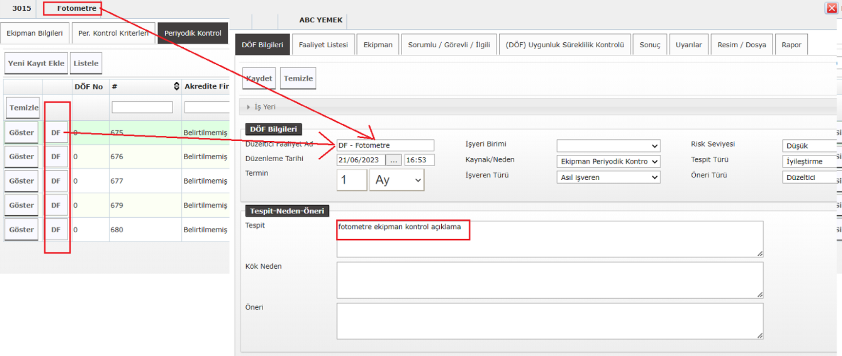 | Açıklama | Ekipman periyodik kontrol ve bakım sekmelerine DF ve Kurula Taşı buton ilavesi DF listesine de DF kaynağı dropboz'ına seçeneklerini ekleyelim. Df butonuna basınca açıklama kısmında yazanları df tespit bölümüne getirelim. | ||||