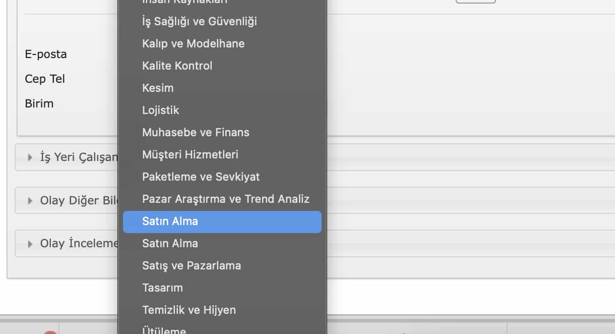 Açıklama | Olay bildirim kartı üzerinde BİRİM Dropbox içinde Satın Alma birimi iki tane görünüyor halbuki birim listesinde bir tane satın alma birimi var. Kontrol edebilir misiniz? | ||||