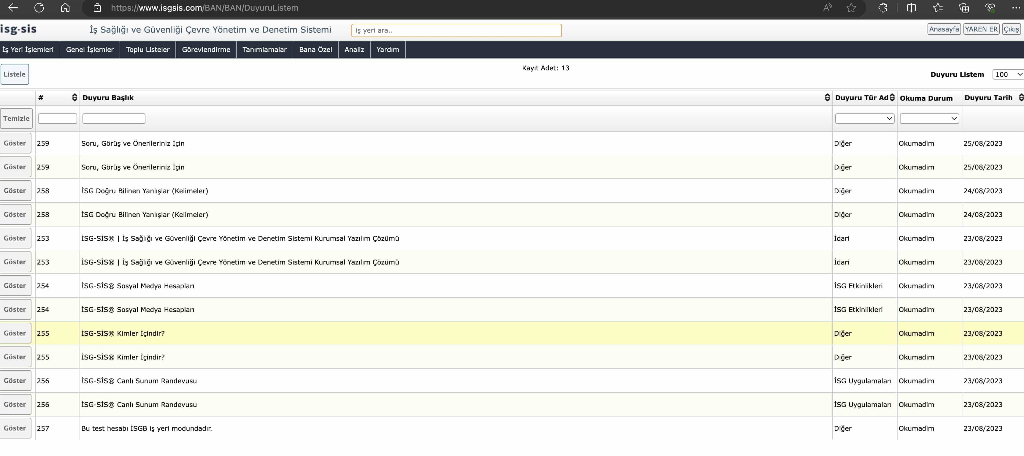 Özet | 0007860: İşletme içi duyurularda ve sistem duyurularında çift duyuru görünüyor | ||||