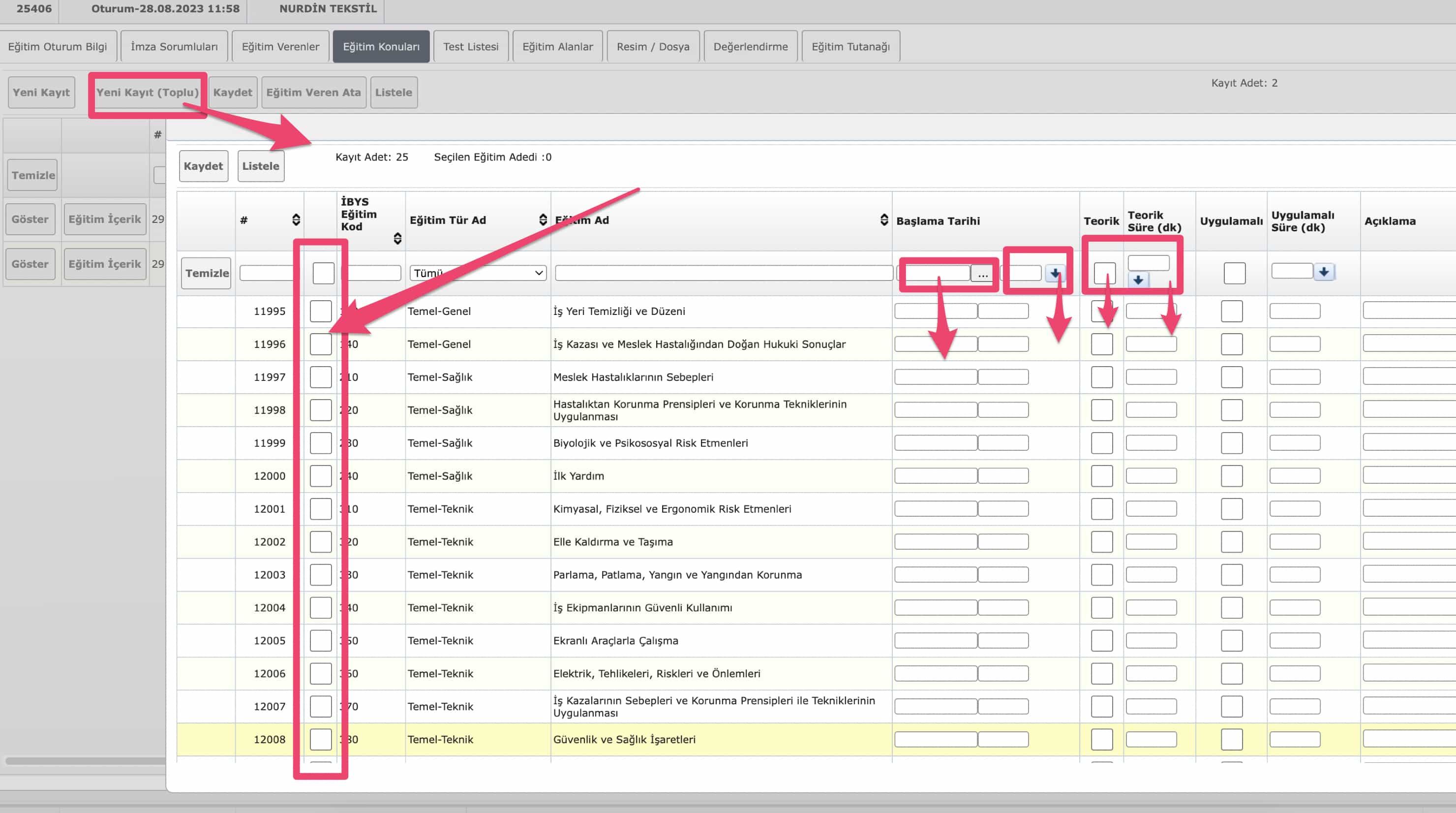 Eğitim Konuları Sekmesi içinde Yeni Kayıt (Toplu) bölümünden çoklu seçmeli işlem yapabilirsiniz sizin de dediğiniz şekilde. |