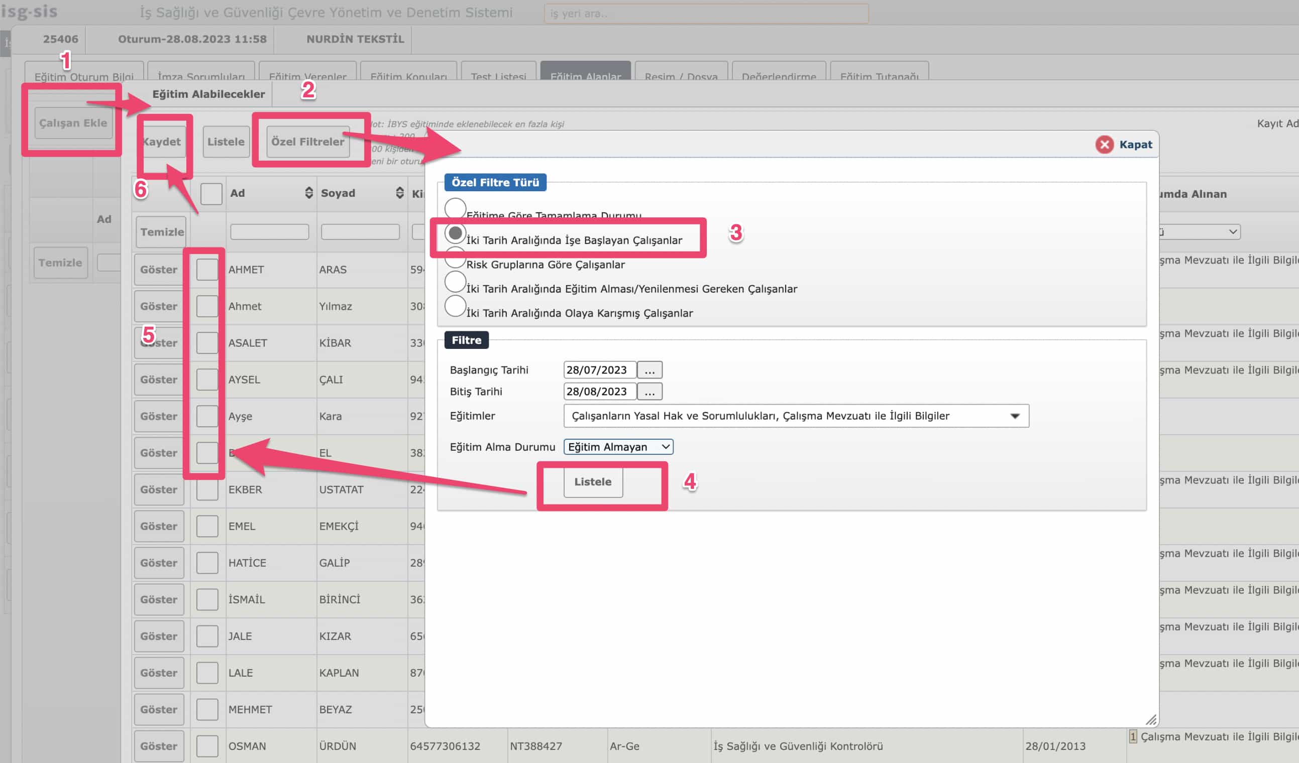 2- Mevcut eğitim organizasyonu kartı içinde Eğitim alan sekmesinde Çalışan Bul dediğinizde ÖZEL FİLTRELERDEN iki tarih aralığında işe girenleri getir dediğinizde yeni işe girenleri ekleyebilirsiniz Süre: 10 sn.