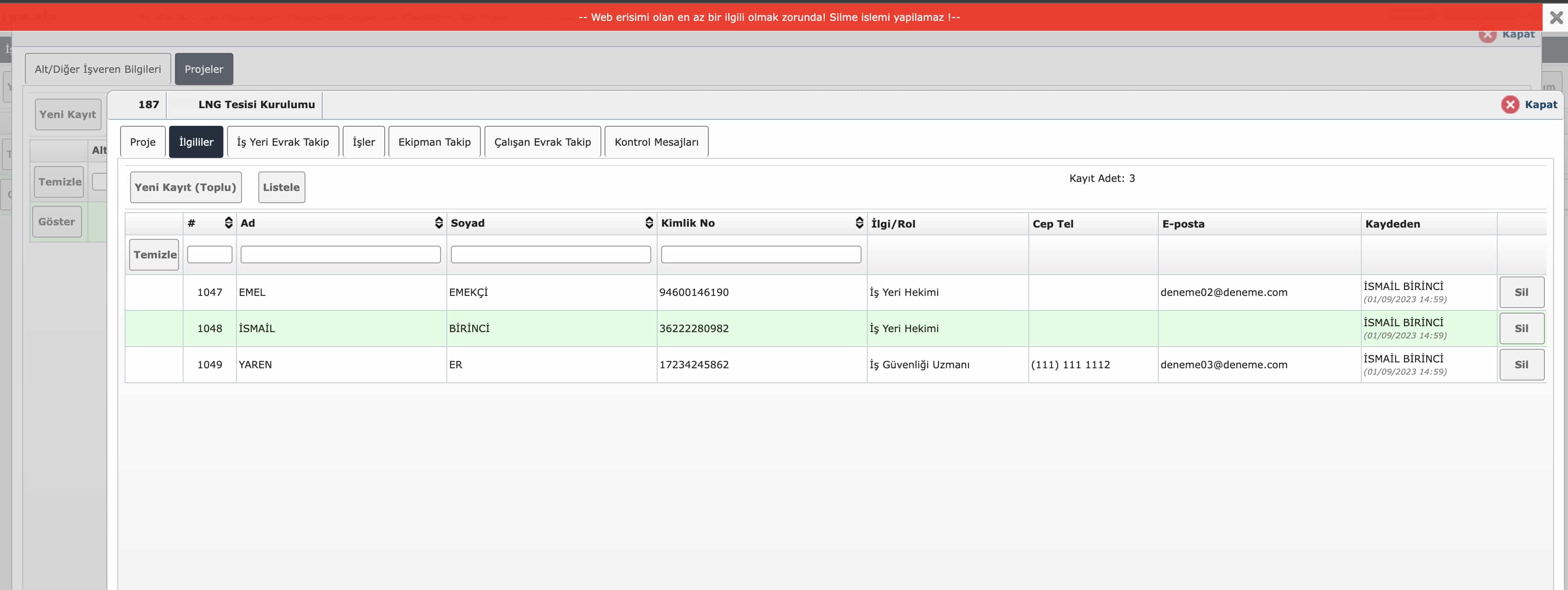 | Açıklama | https://www.isgsis.com/PLN/ALT/isyeriAltisverenListe sayfasında; Birde çıkan uyarı yazısında TR karakterleri düzeltelim. Olması gereken; -- Web erişimi olan en az bir ilgili olmak zorunda! Silme işlemi yapılamaz!-- | ||||