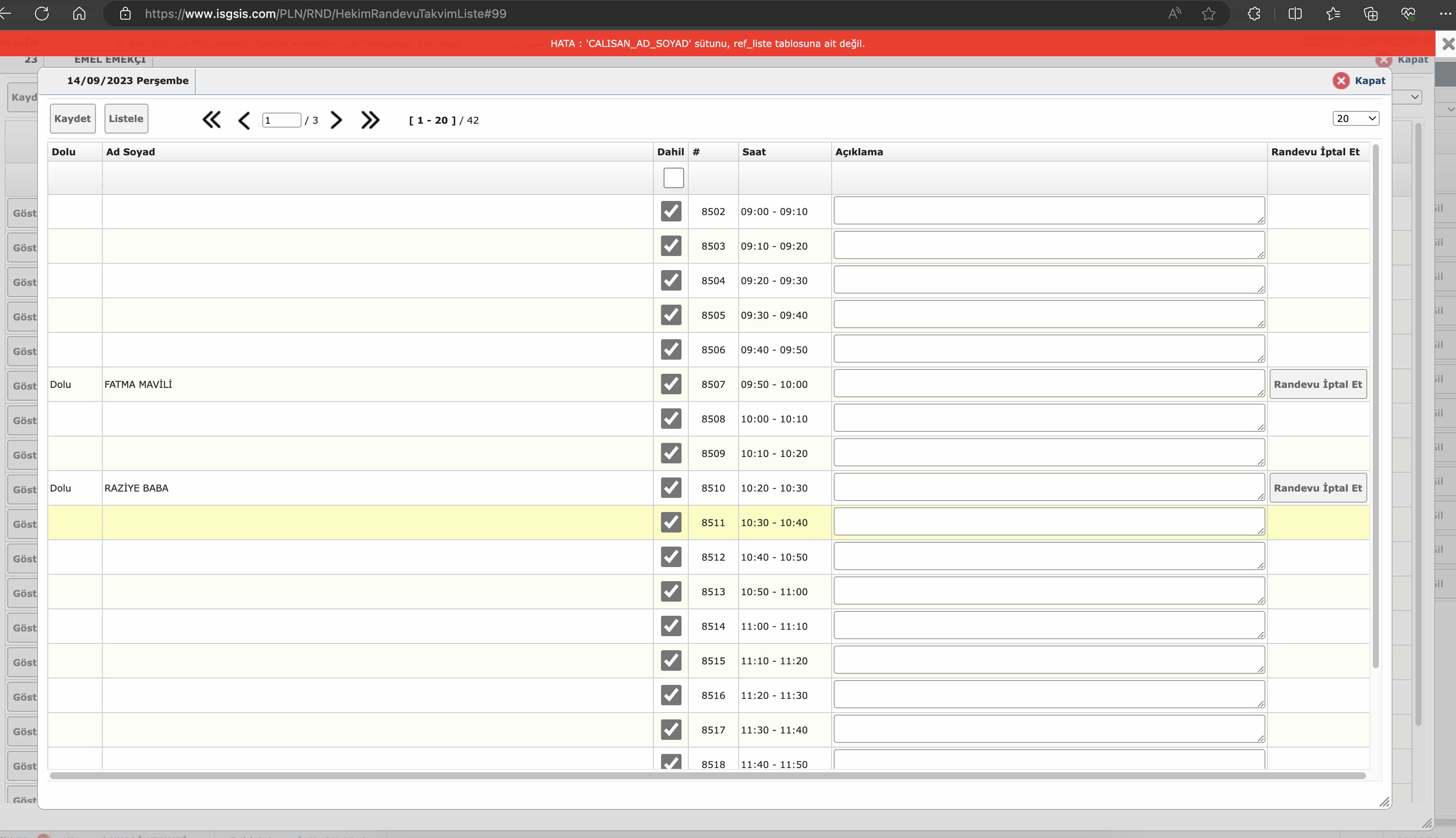 Özet0007920: İş yeri hekimi olarak ilgili sayfada randevu iptali yapamıyorum resimdeki hata çıkıyor düzeltebilir miyiz?