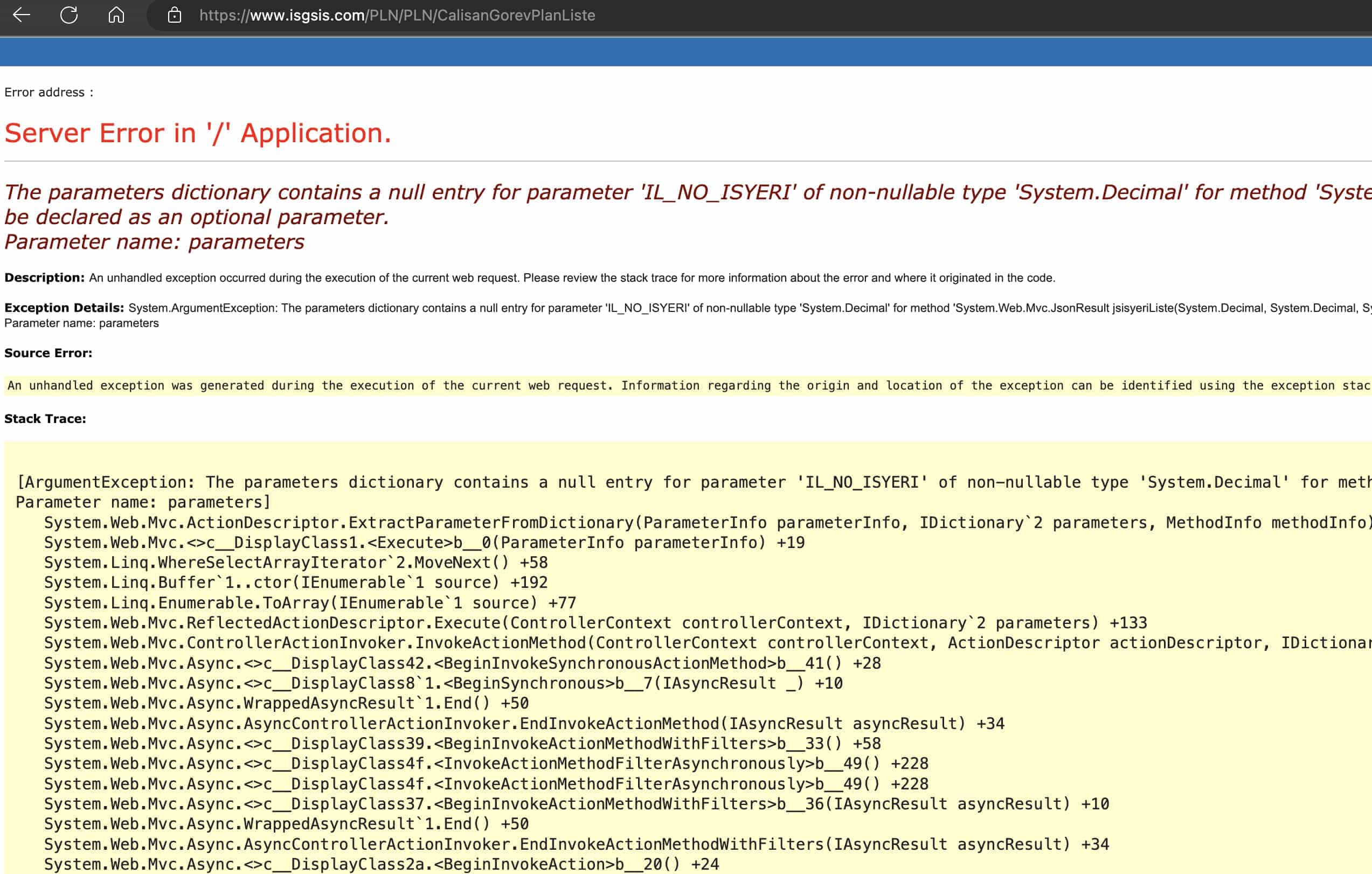 /PLN/PLN/CalisanGorevPlanListe yeni kayıt açılan kartta ... tıklanıp işletme seçildiğinde sayfa patlıyor