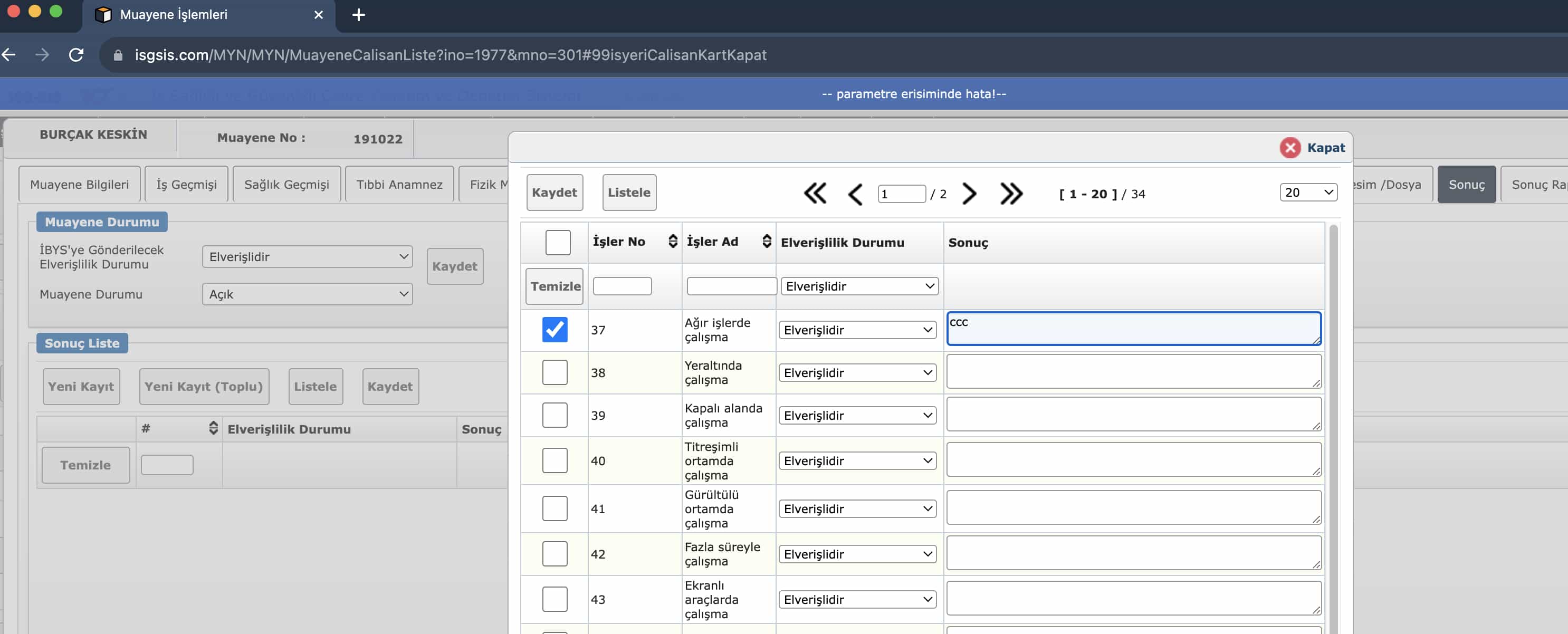| Açıklama | Muayene sonuç sekmesinde yeni toplu kayıtta sonuç metin kutusuna bir şey yazdığımda kaydetmiyor parametre hatası veriyor | ||||
