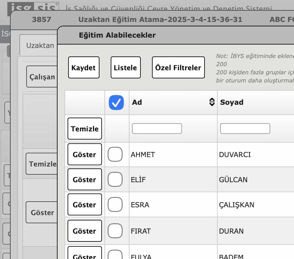 Özet | 0008924: Uzaktan eğitim eğitim alan çalışan ekle dediğimde tümünü seç tiki çalışmıyor tıkladığımda hiç seçim yapmıyor | ||||